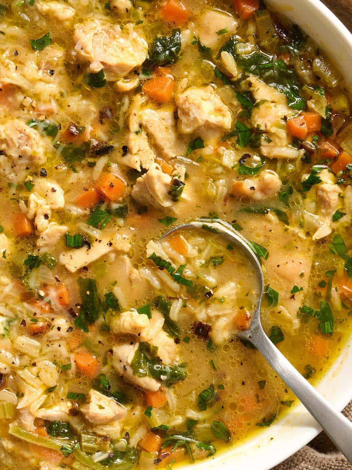 - Grain Integration: Long-grain white rice and frozen spinach are added to the simmering broth. The rice cooks directly in the seasoned liquid for 15 minutes, allowing it to absorb the savory chicken essence while simultaneously thickening the broth with its natural starches.