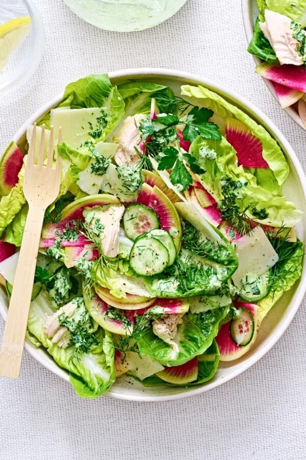 Beyond the high-protein chicken and the innovative dressing, the careful selection of supporting ingredients plays a vital role in the salad’s overall appeal and nutritional value. Crisp romaine lettuce provides a foundational crunch and a mild, slightly bitter base, rich in vitamins A and K. Crunchy cucumbers introduce a refreshing, watery element that provides a textural contrast to the richness of the dressing and the tenderness of the chicken, also contributing hydration and various micronutrients. Shaved Parmesan cheese adds a salty, nutty depth and a delicate, savory texture, providing calcium and intense umami notes. Peppery radishes contribute a vibrant, spicy bite and additional visual appeal, particularly if using varieties like watermelon radishes, which are noted for their striking pink interiors and mild pungency, along with their digestive benefits. The deliberate omission of croutons, a staple of traditional Caesar salads, is a strategic choice to keep the dish lighter, allowing the nuanced flavors of the fresh ingredients and the complex dressing to take center stage, while also significantly reducing carbohydrate intake. This further reinforces the recipe’s health-conscious positioning without sacrificing flavor or satisfaction.
