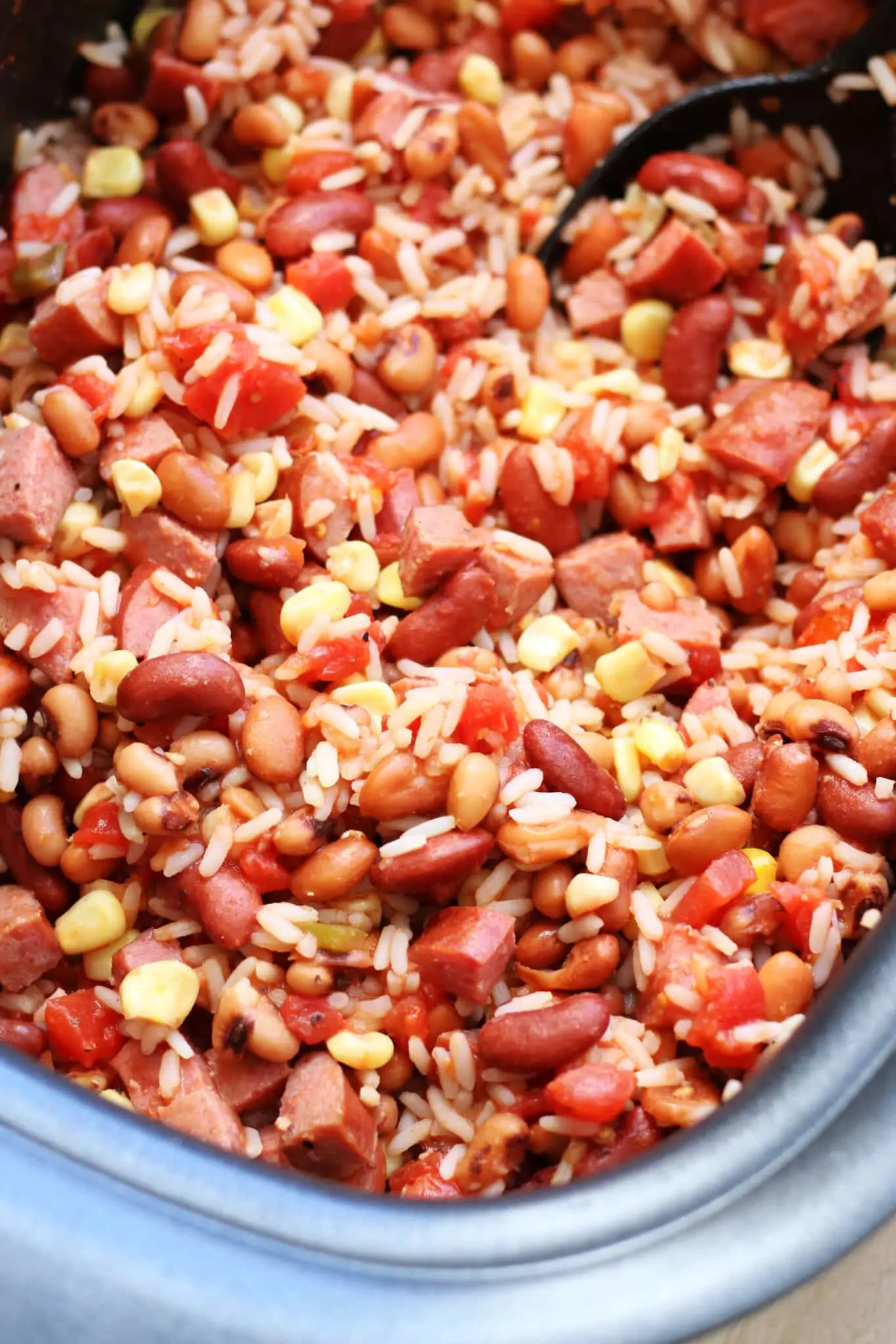 3. Phase Three: Thermal Processing (2–4 Hours): The slow cooker is set to either "High" for a shorter duration (2–3 hours) or "Low" for a longer period (4 hours). During this time, the rice absorbs the surrounding moisture and the smoky oils from the sausage permeate the beans and corn.