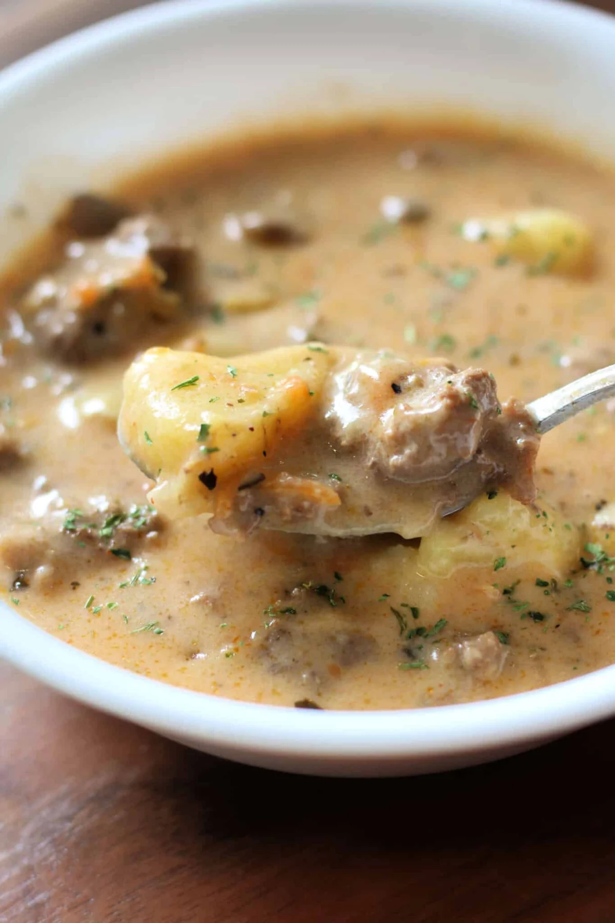 For those opting for the crockpot method, the beef and onions must be browned on a traditional stovetop before being transferred to the slow cooker. The vegetables and broth are simmered on "Low" for six to eight hours or "High" for three to four hours. The dairy and thickening agents are added in the final 30 minutes of cooking to ensure the cream does not break down over the long heating period.